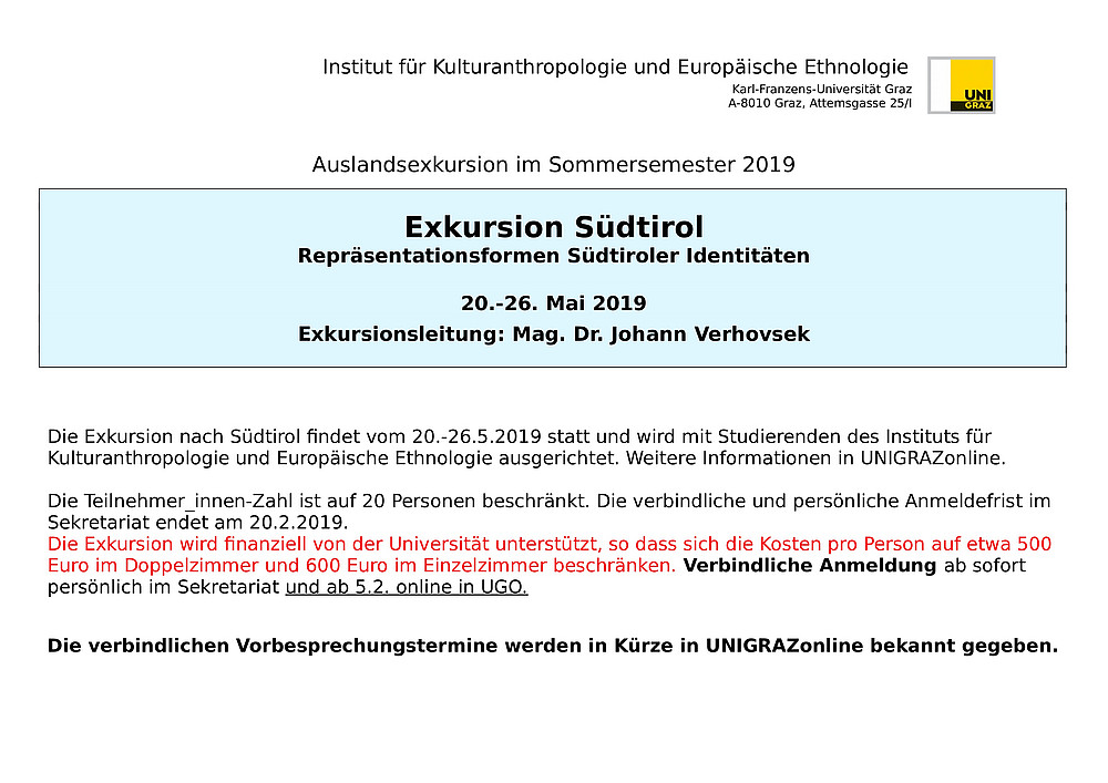 Die Exkursion wird finanziell von der Universität unterstützt, so dass sich die Kosten pro Person (Fahrt und Übernachtungen) voraussichtlich auf etwa 500 bis 600 Euro beschränken. Verbindliche und persönlich Anmeldung im Sekretariat ab sofort und online in UNIGRAZonline.