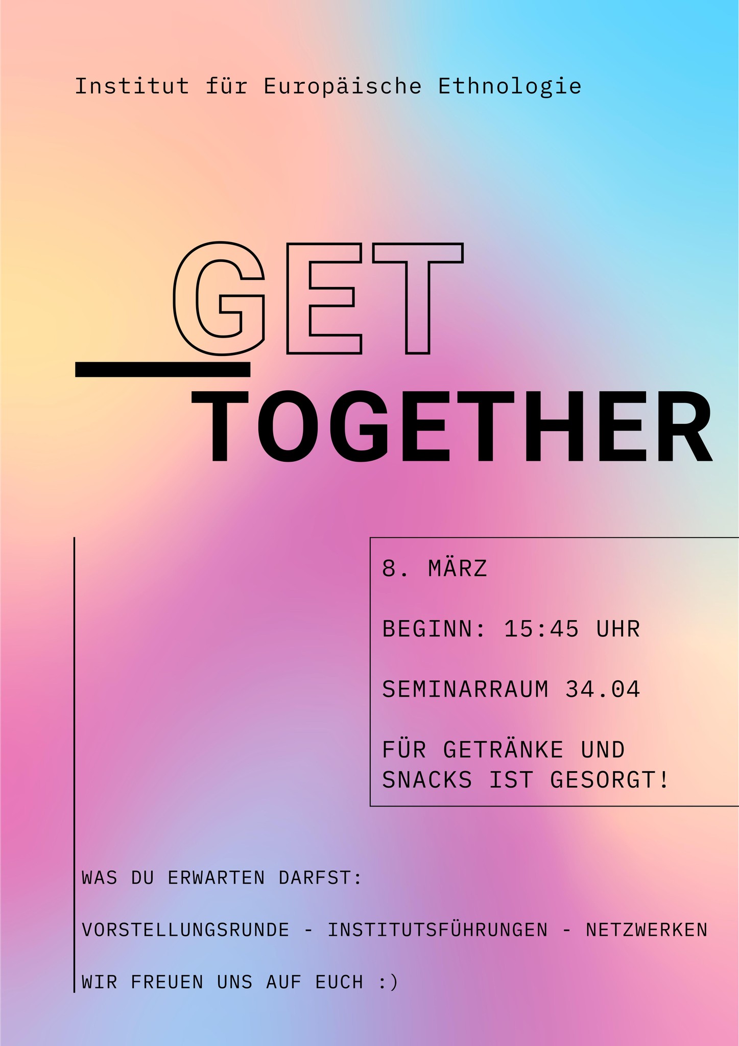 Zum Auftakt des Sommersemesters laden wir alle neue Student:innen aber natürlich auch alle Interessierten aus höheren Semestern herzlich zu einem Get-Together am Mittwoch, dem 8. März 2023, ein. Wir treffen uns um 15:45 im Seminarraum 34.04, im Hochparterre des Instituts. Anschließend gibt es eine Vorstellungsrunde der Lehrenden, eine Institutsführung und natürlich genug Zeit zum Austauschen und Kennenlernen.